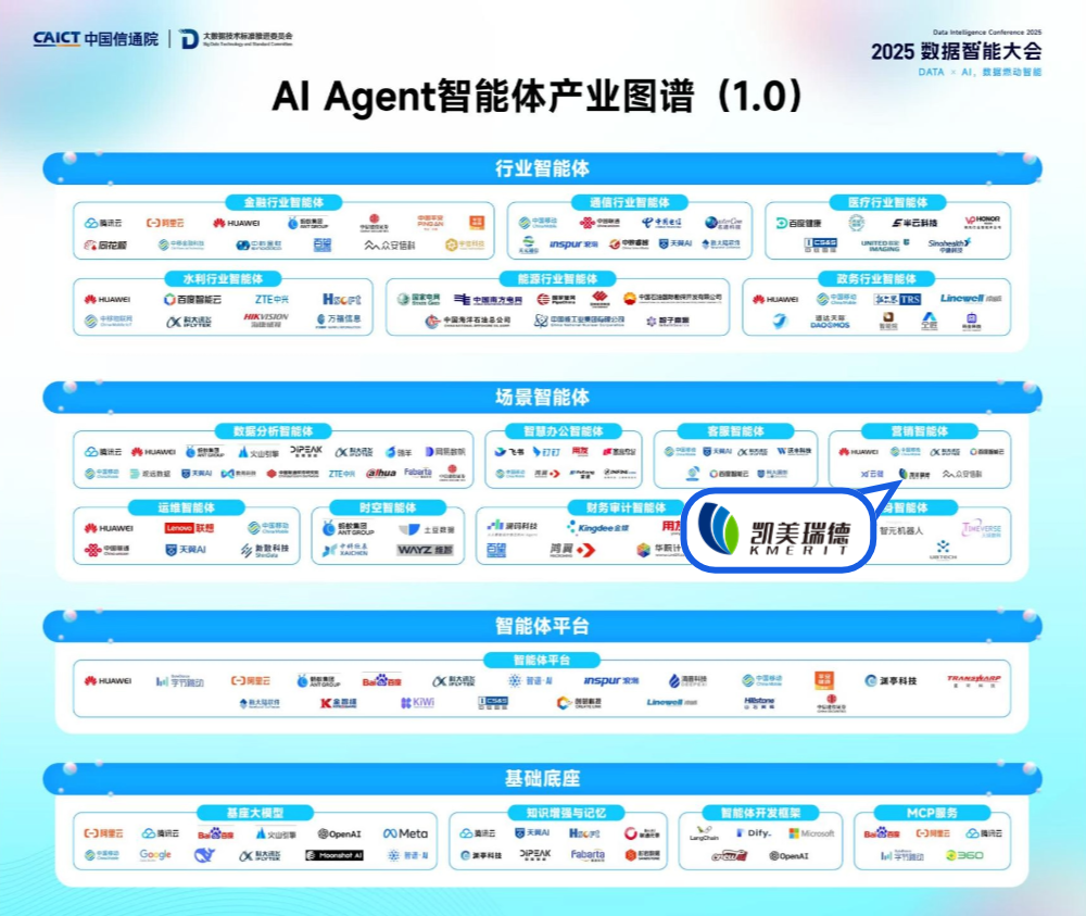 近日,由中国通信标准化协会主办,中国信通院、大数据技术标准推进委员会联合承办的“2025数据智能大会”在京盛大召开。大会期间,中国信通院为系统梳理智能体产业格局、核心技术及商业落地路径,正式发布了《AI Agent智能体产业图谱1.0》。凯美瑞德凭借自研的智能体平台产品及在金融领域的人工智能深度应用实践,成功入选该图谱“营销智能体”领域的首批代表厂商。