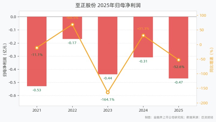 4月23日,至正股份发布2025年年报。报告显示,2025年公司实现营业总收入5.50亿元,同比增长50.95%;归母净利润-0.47亿元,同比下滑52.62%;扣非归母净利润-9643.89万元,同比下滑171.00%;基本每股收益-0.58元;加权平均ROE为-11.72%;经营活动净现金流-1408.77万元,同比增长47.38%。
