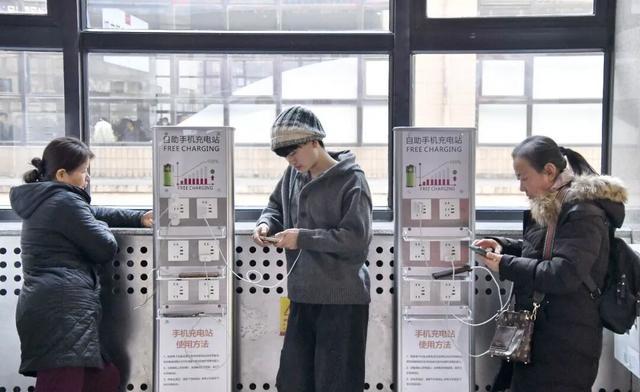 2月12日,旅客在北京西站候车大厅内的免费充电服务区给手机充电/新华社记者 李欣 摄